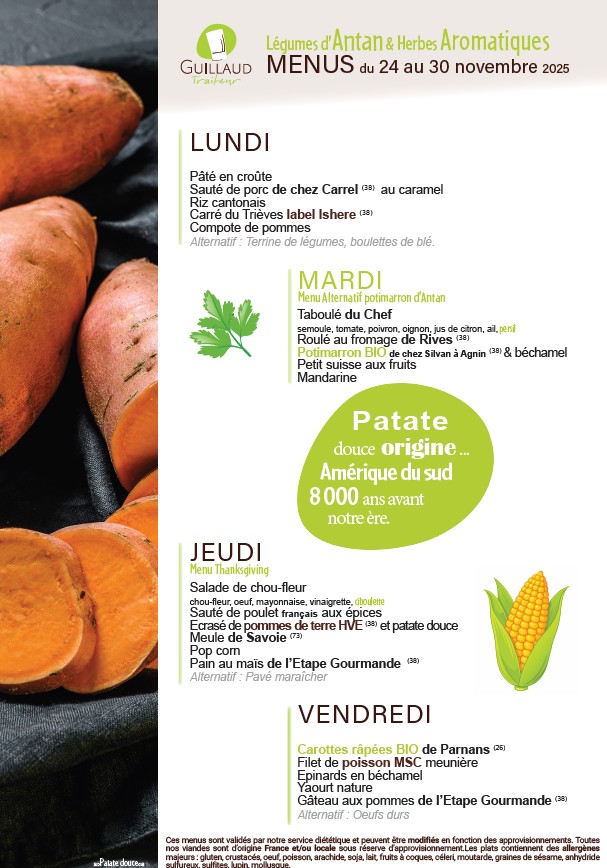 Menu de la semaine du 24 au 28 novembre2025 Retrouvez le menu du lundi 24 au vendredi 28 novembre 2025