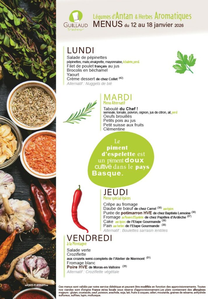 Menus de la semaine du 12 au 16 janvier 2026 Retrouvez le menu du lundi 12 au vendredi 16 janvier 2026