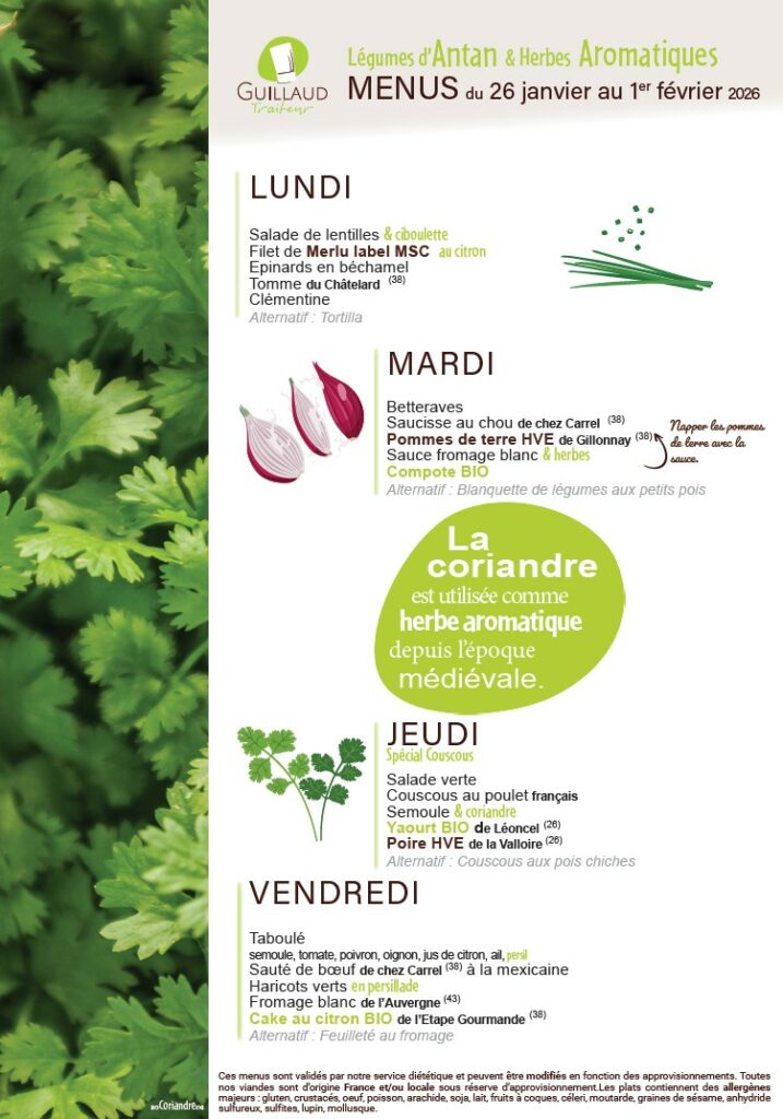 Menus de la semaine du 26 au 30 janvier 2026 Retrouvez les menus du lundi 26 au vendredi 30 janvier 2026